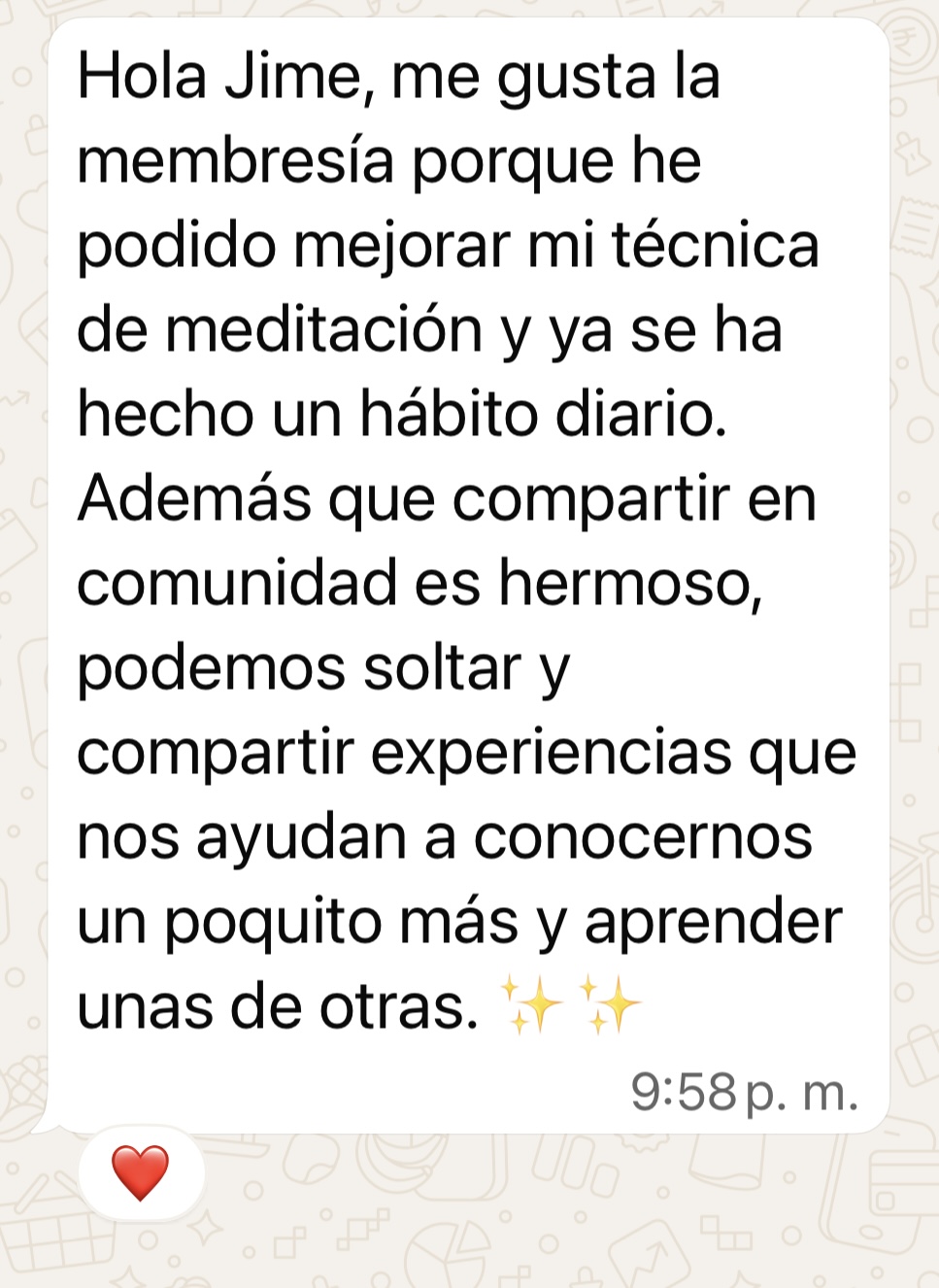 Nos juntamos una vez a la semana para meditar via zoom, y así ir incorporando la práctica de la meditación que tiene muchos beneficios en la relación con nuestro cuerpo.
